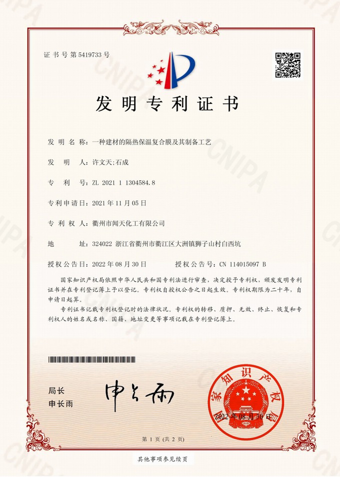 衢州市聞天化工有限公司成立于2003年,是國內研發、生產氟碳涂料的企業。衢州傳褀防水防腐工程科技有限公司作為其下屬公司,專業承接各類防水防腐項目。企業經過20年的市場磨練,已在鋼構防腐領域、建筑屋面和屋面修繕、防水隔熱領域、建筑外立面的防水隔熱裝飾領域及戶外竹木防腐領域形成了自己獨特的產品體系和個性化解決方案。公司經過多年的努力,已獲得了多項國家發明專利和新產品科技成果,并參與了中國建筑材料流通協會組織的《房屋修繕防水工程規范》的編制,中建協涂裝委員會浙西工作站設立在我公司。公司的產品有一個共同的特點,就是經久耐用,使用年限超長。鋼構防腐的效果是其他材料的三到五倍使用壽命;屋面防水隔熱的效果是其他材料的三到五倍的使用壽命;建筑外立面的效果是既防水又隔熱保溫,既美觀又不褪色;戶外竹木防腐的效果更是其他材料五倍以上的壽命。